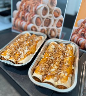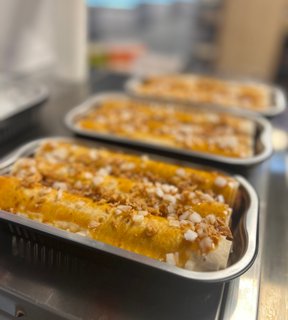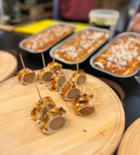 Bereiding: Snijd met mes de frikandel in zoals bij een frikandel speciaal. Frituur de frikandellen, en laat ze daarna afkoelen. U kunt ook perfect een ovenfrikandel hiervoor gebruiken. Vul daarna de frikandel met streep Tom-Chi topping en zet ook een streep Tom-Chi topping langs de frikandel op de wrap. Rol dan de frikandel op in de wrap en snijd de uiteinden van de wrap af. U kunt er ook voor kiezen de wraps voor het inrollen al op maat te snijden. Leg daarna 3 opgerolde frikandellen in de aluminium schaal. Voorzie elke frikandel van een streepje curry aan de bovenzijde, en verdeel dat netjes. Strooi daarna de gebakken en verse ajuin over de frikandellen. LET’S WRAPADEL… Adviseer uw klanten om het bakje 10 min op 180 graden in voorverwarmde oven te verwarmen.